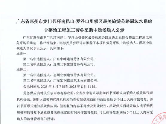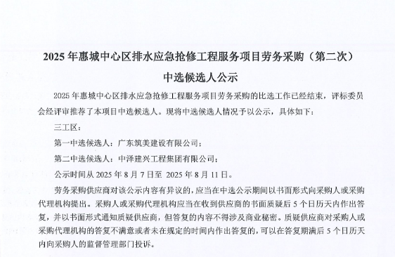 廣東省惠州市中心城區(qū)地下管網(wǎng)系統(tǒng)提升工程-內(nèi)街小巷排水管網(wǎng)病害修復(fù)及錯混接改造項(xiàng)目一期施工勞務(wù)采購(第二次)中選候選人公示……